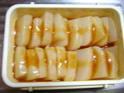 4)熱いうちに(←コレ重要!)タレに浸けます。満遍なくまぶして、ぴっちりラップで落し蓋。で、最低1時間放置。できれば半日以上。