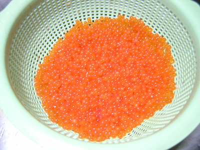 ・ばらした筋子を洗い、ざっとかきまぜたらザルにあけ、また新しい水で洗う、の繰り返し。水の濁りがなくなるまで5~6回くらい。