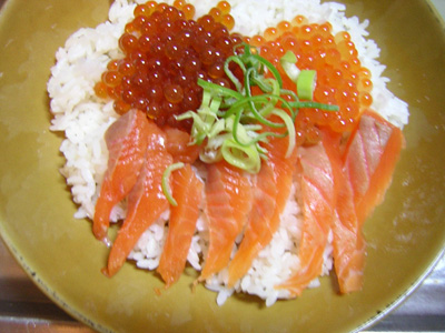 上の写真は親子丼。左が醤油、右が塩。下はトロサーモン刺身。