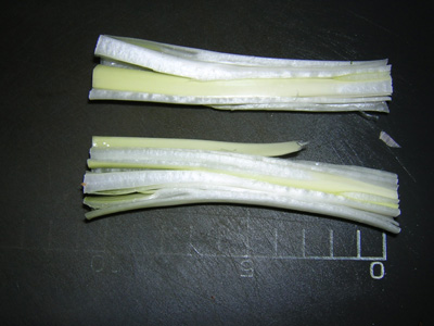 ※左は切り落としたもの。アップで見れば切目が入っているのが分かるかと。で、右が切目を入れて開いたもの(やや切りすぎ;)。